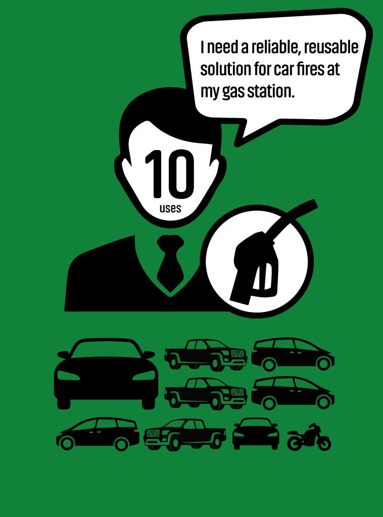 At charging stations, it swiftly and safely isolates fires in lithium-powered vehicles.